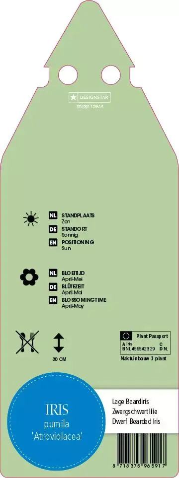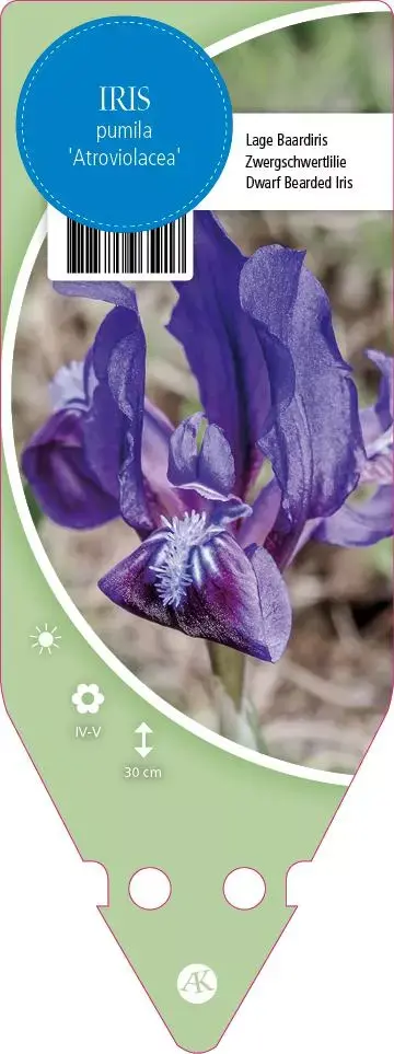 De vaste plant Iris Pumila Atroviolaca (Dwerg-zwaardlelie) is een rotsplant. Plant de Iris Pumila Atroviolaca op een plek met zon en plaats maximaal 5 planten per vierkante meter. Deze plant heeft een maximale hoogte van 30 cm als volwassen plant. De bloemkleur is blauw.