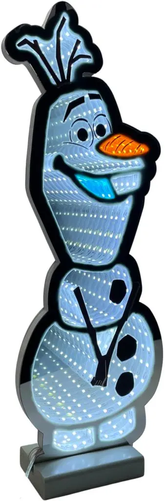 Breng winterse magie in huis met deze prachtige Infinity Light van Disney’s Olaf. Met zijn vrolijke lach, feestelijke kerstmuts en heldere witte LED-verlichting straalt Olaf pure kerstsfeer uit. Het indrukwekkende 65 cm formaat en het betoverende diepte-effect maken hem tot een schitterende blikvanger in elke ruimte.