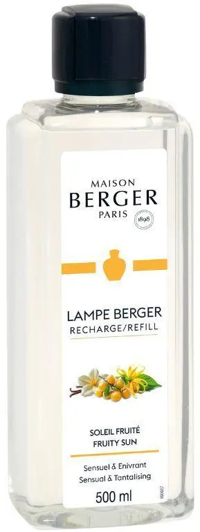 Het Lampe Berger huisparfum Soleil Fruité 500ml onthult een stralend en verfijnd parfum, een ode aan de zomer. Mirabel, perzik en ananas zorgen voor een fruitige en levendige opening die doet denken aan warme zonnestralen. Het hart van de compositie bloeit op met jasmijn, lelietje-van-dalen en ylang-ylang, voor een betoverende bloemige sensualiteit, als een tuin vol licht. De basisnoten van muskus, sandelhout en vanille omhullen de ruimte met een warme, houtachtige en geruststellende toets, en laten een subtiel parfumspoor achter. Deze navulling zuivert en parfumeert de lucht in uw interieur, met tot 20 uur verspreiding en 80 uur parfumbeleving.