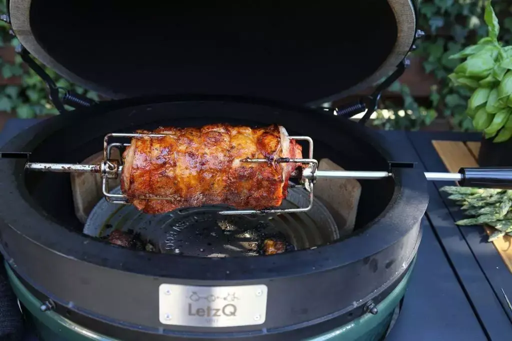 LetzQ spit 15 inch medium met een RVS draai spit en elektrische motor van 4 watt, waar je een bijvoorbeeld een heerlijk kippetje mee kan grillen. Normaal is een kip op de kamado al een heel fijn gerecht maar van het spit komt die nog sappiger van de kamado.