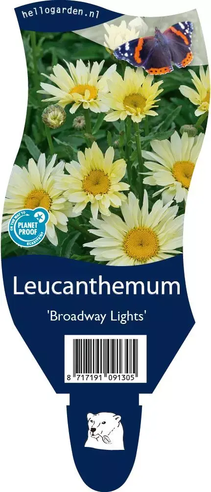 De vaste plant Leucanthemum 'Broadway Lights' (Margriet) is een vlinderlokkende plant. Plant de Leucanthemum 'Broadway Lights' op een plek met zon en plaats maximaal 7 planten per vierkante meter. Deze plant heeft een maximale hoogte van 80 cm als volwassen plant. De bloeiperiode is in mei, juni, juli en de plant is winterhard tot -20ºC.