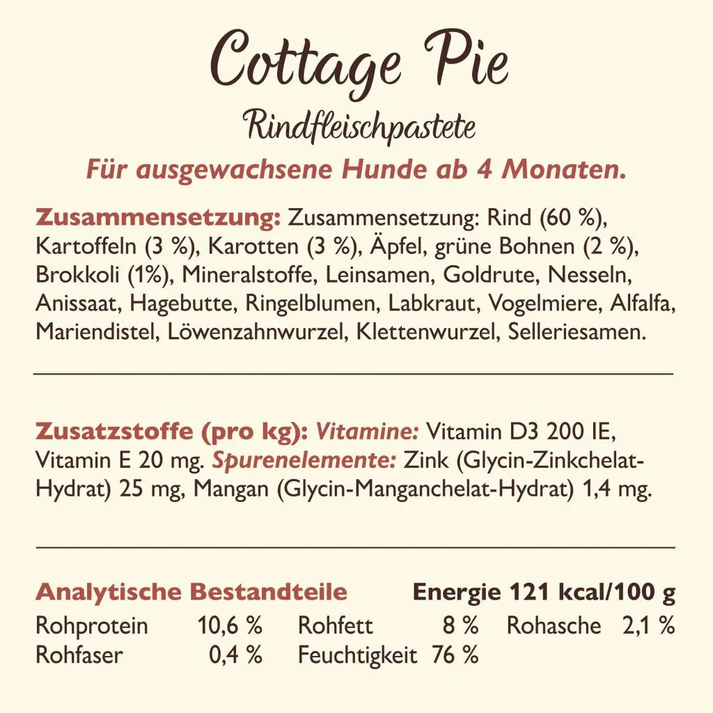 Samenstelling: 60% Vers bereid Rundvlees, Aardappelen (3%), Wortels (3%), Appels, Broccoli, Sperziebonen, Vitaminen en Gecheleerde Mineralen, Lijnzaad. Planten en kruiden: Guldenroede, Brandnetel, Anijszaad, Selderiezaad, Rozenbottels, Goudsbloemblaadjes, Kleefkruid, Zeewier, Alfalfa, Mariadistel, Paardenbloemwortel, Kliswortel.
