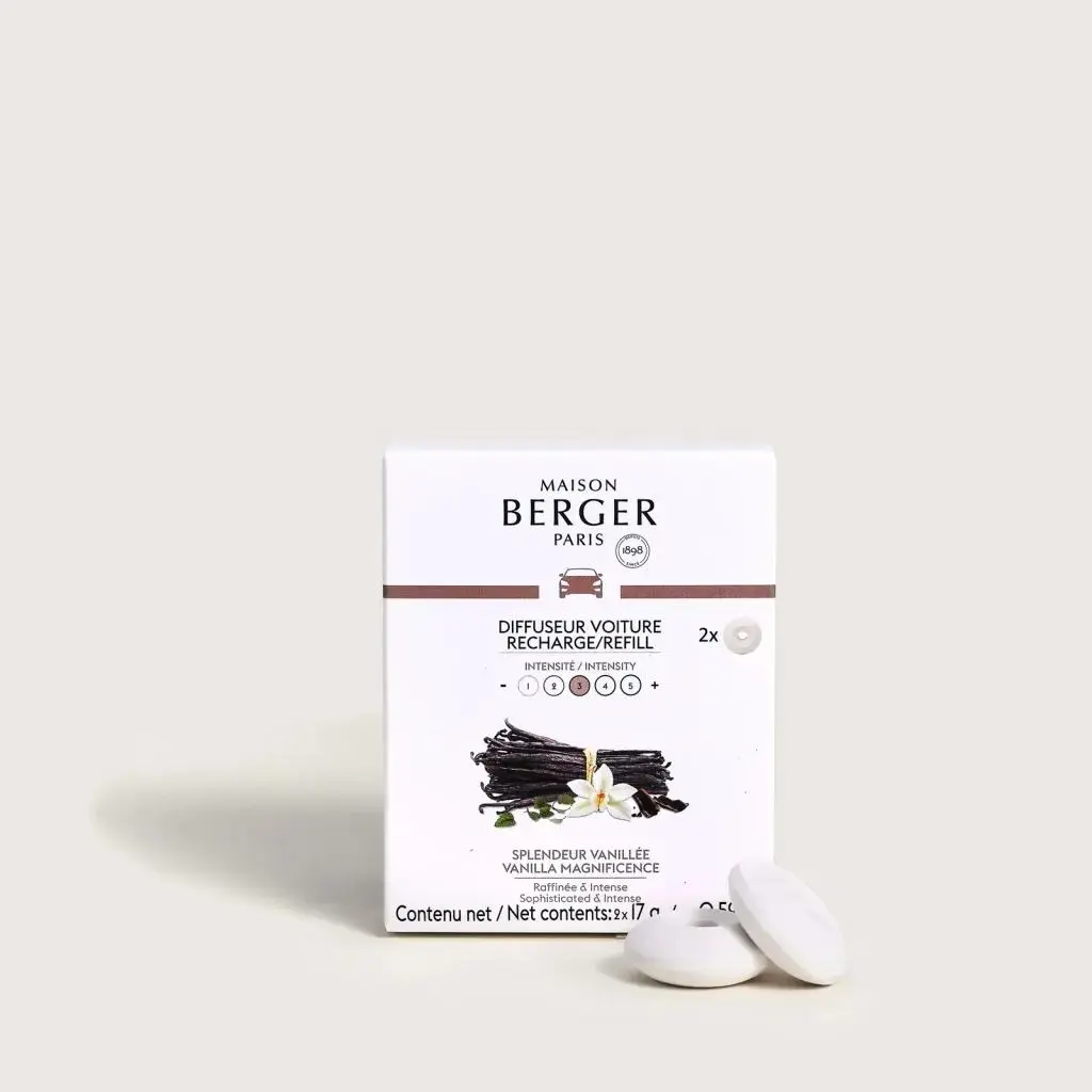 De navullingen autodiffuser Splendeur Vanillée nodigen u uit om uw reis te verrijken met een voortreffelijke parfumbeleving. Splendeur Vanillée opent met sprankelende topnoten van sinaasappel, mandarijn en kardemom, die exotische landschappen oproepen. Het kruidige hart onthult zich met zwarte peper, rumakkoord en cacaoboon, waardoor een symfonie van betoverende geuren ontstaat. Tot slot voegen de basisnoten van Bourbon Vanille, sandelhout en patchouli een vleugje zoetheid en verfijning toe. Deze navullingen, speciaal voor uw Maison Berger autodiffusers, zorgen voor een optimale parfumverspreiding gedurende ongeveer 4-6 weken. Ze veranderen elke reis in een voortreffelijke zintuiglijke ontsnapping, en brengen een vleugje verfijning en een uniek olfactorisch welzijn in uw voertuig.