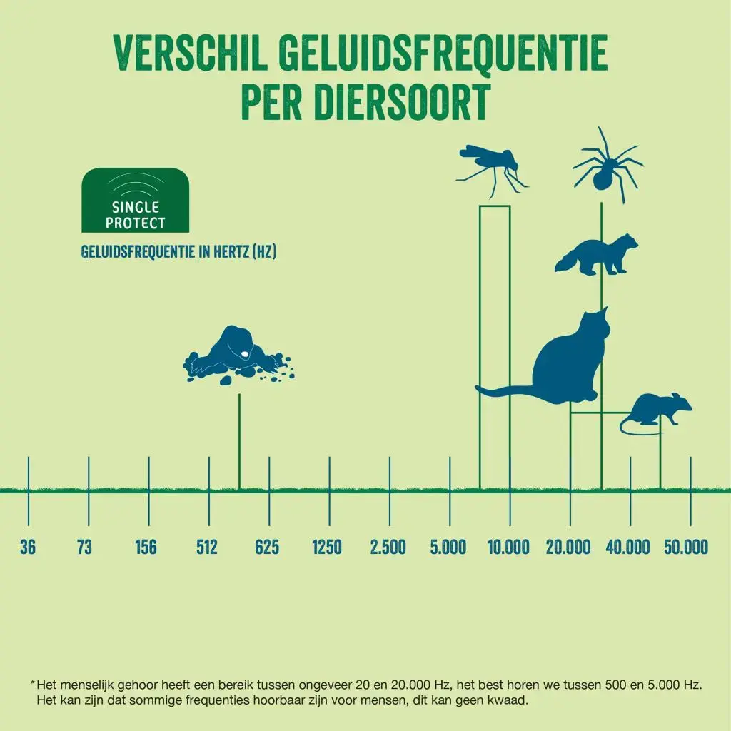 - De variërende frequentie voorkomt dat marters resistent worden. Het geluid kan voor sommige mensen hoorbaar zijn, maar dit is onschadelijk. Het geluid is niet hoorbaar voor vogels en vissen maar wel voor katten en honden.