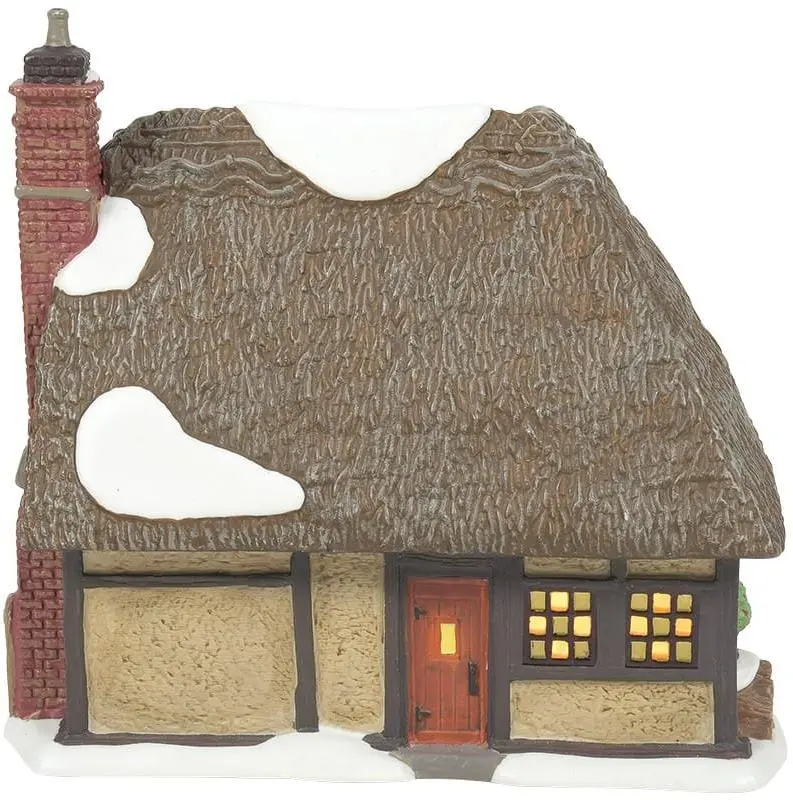 Een meester-thatcher's cottage met het traditionele rieten dak dat zo kenmerkend was voor het Engelse platteland. Een prachtig stuk dat dit ambachtelijke vakmanschap laat zien, tegen de sfeervolle achtergrond van kerst. Onderdeel van de Dickens Village-collectie van Department 56.