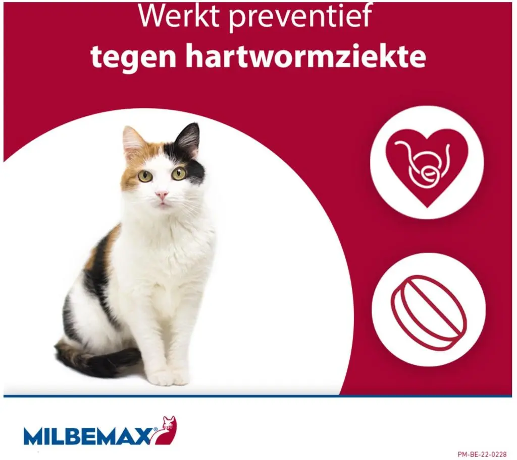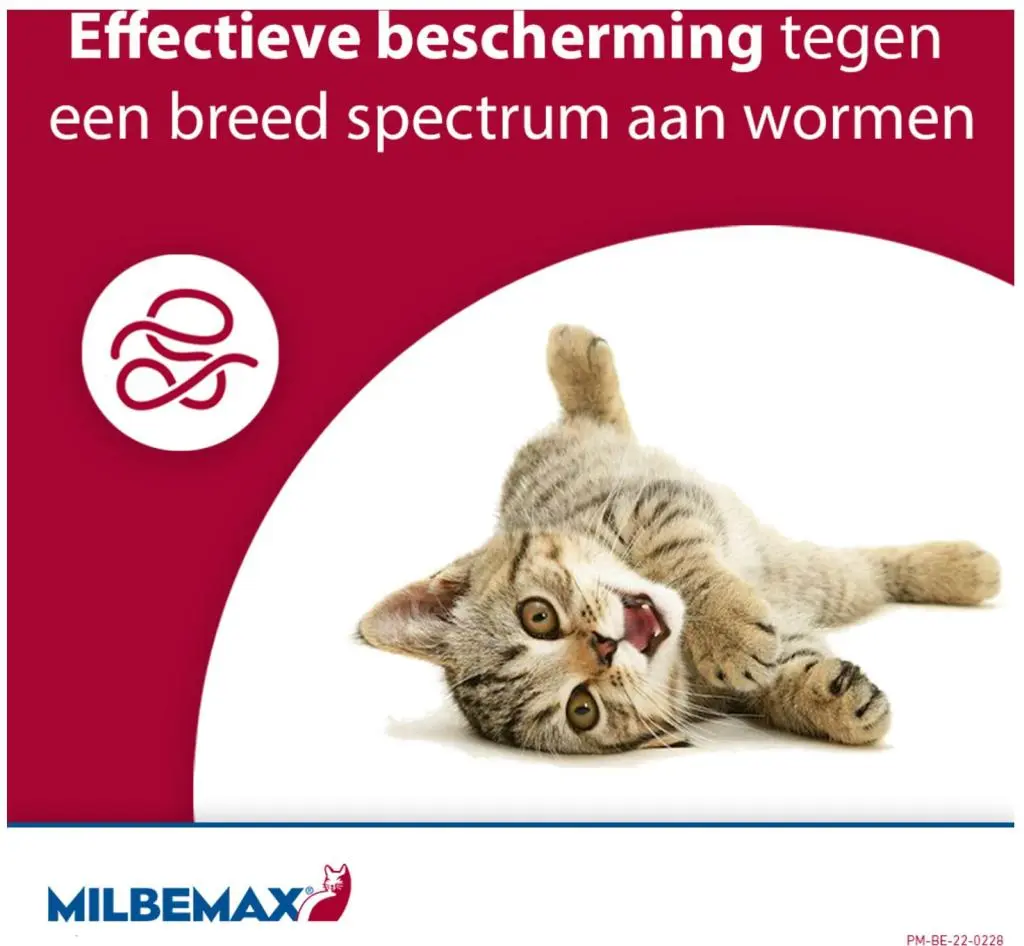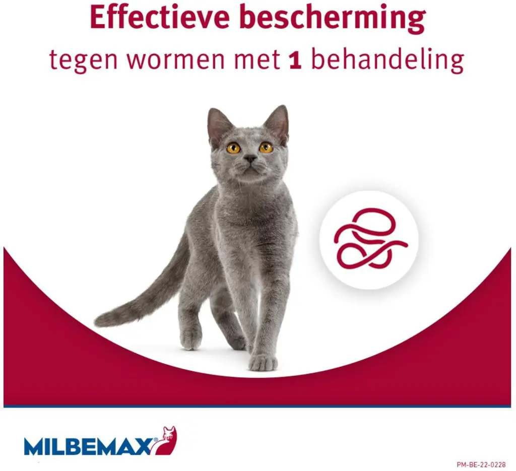 Deze tabletten zijn geschikt voor katten van 2 tot 12 kg en bevatten de werkzame stoffen praziquantel en milbemycine. Daarmee bestrijdt Milbemax bestaande wormbesmettingen en werkt het bovendien preventief tegen hartworm.