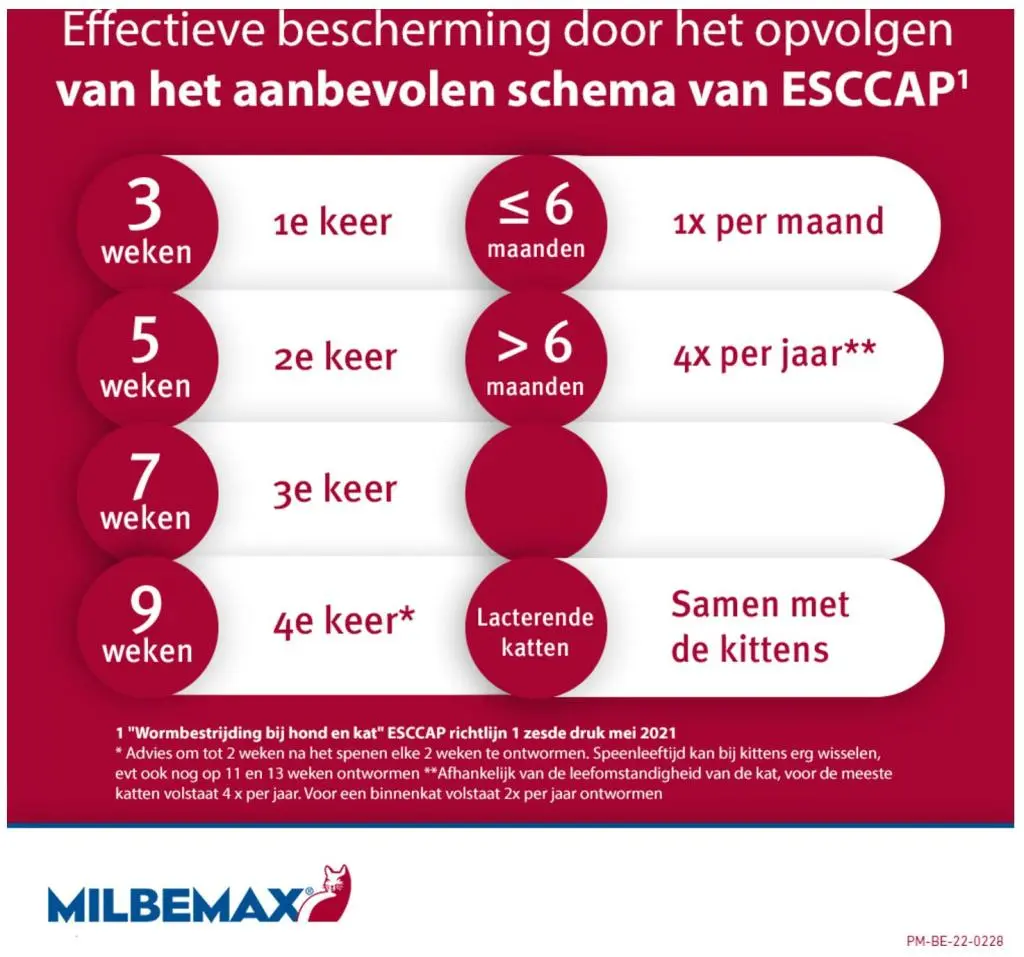Gebruik Milbemax niet bij katten jonger dan 5 weken. Voor katten lichter dan 2 kg kies je Milbemax Kleine Kat & Kitten.