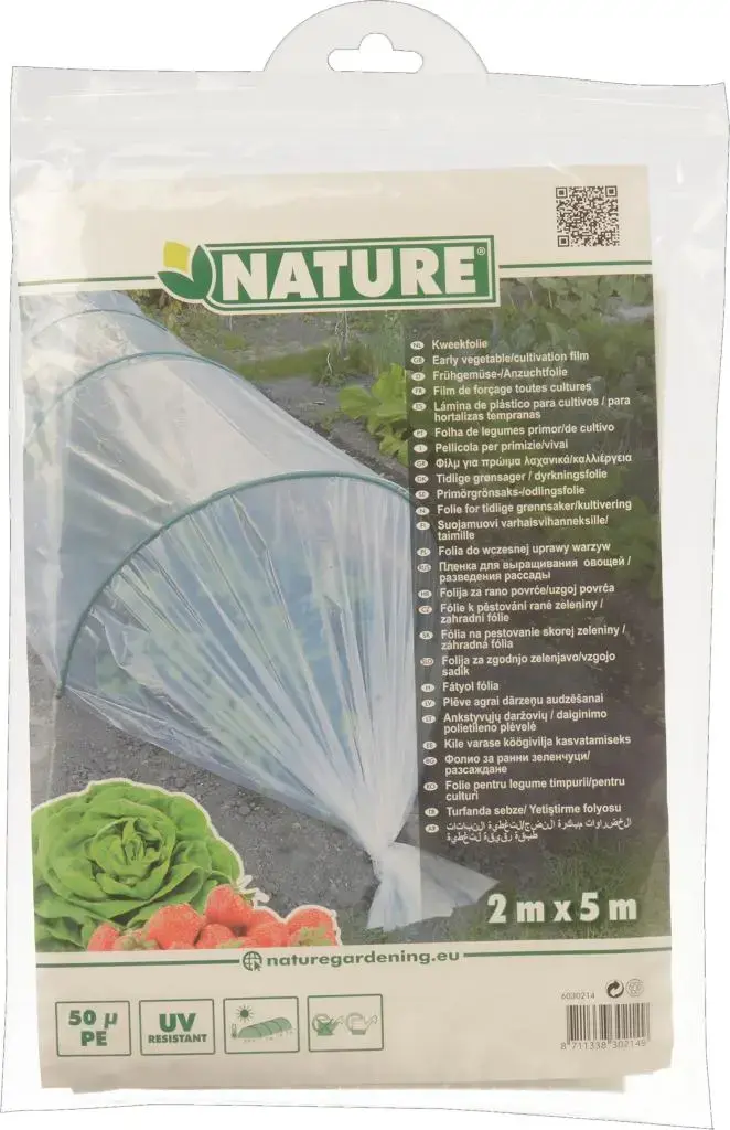 Nature uv-bestendig groei- en afdekfolie van doorzichtig polyethyleen (LDPE) met een dikte van 50 µ, aan te brengen op tunnelbogen. Bevordert de groei van zaailingen en jonge plantjes. Deze folie zorgt ervoor dat de temperatuur in de tunnel enkele graden hoger ligt dan de buitentemperatuur. De groentezaailingen krijgen op die manier een drietal weken voorsprong. Afmeting 2 x 5 m.