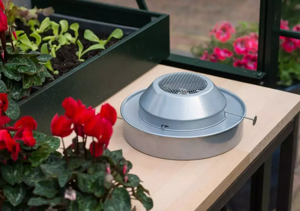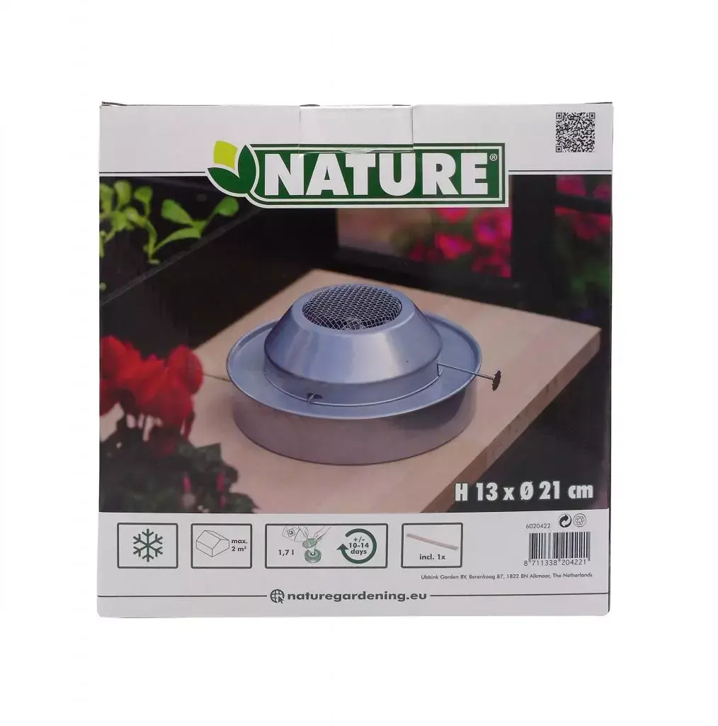 Deze tuinkasverwarmer van Nature van verzinkt metaal heeft een capaciteit van 1,7 l, uitsluitend te vullen met paraffineolie. De kleine brander verwarmt de kas (voor een oppervlakte kleiner dan 2 m2) zodat er geen vorstschade in de kas ontstaat. Brandduur: ca. 10 dagen. Hoogte 13 cm, doorsnede 21 cm. LET OP: gebruik alléén paraffineolie! Zorg voor voldoende ventilatie.