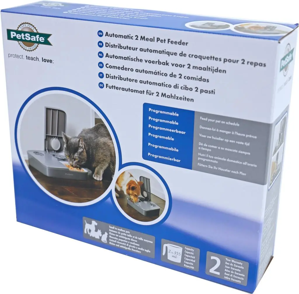 De PetSafe voederautomaat voor 2-maaltijden werkt op batterijen en geeft voer, snacks en medicijnen af op elk gewenst tijdstip 24/7. Ideaal voor zowel uw hond als kat. Er zijn twee bakjes en een timer waarmee kan worden aangegeven wanneer welk bakje voer geeft. Het eenvoudig te lezen display en de vaatwasser bestendige bakjes zorgen voor een gebruiksvriendelijke voerbak.
