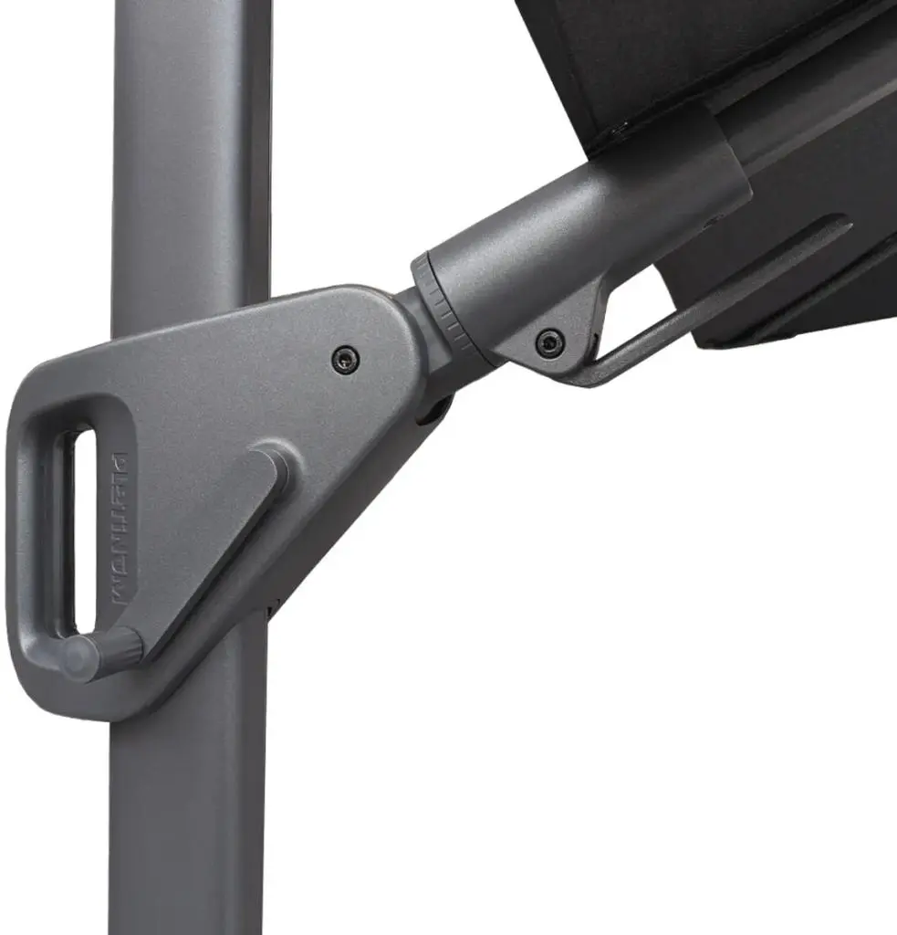 - Schaduwvlak: Geeft veel schaduw zonder te parasol te verplaatsen door T² achterwaartse en zijwaartse kantelbaarheid en de 360 graden draaibare voet.