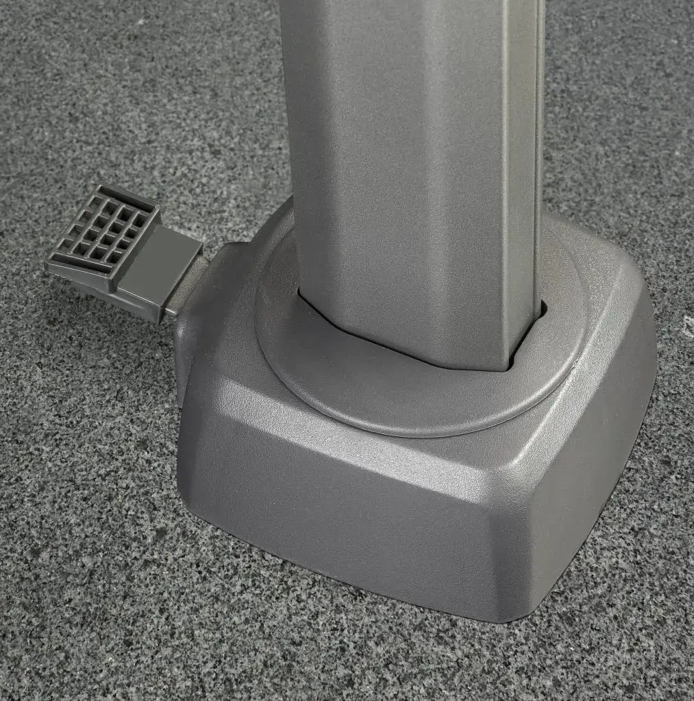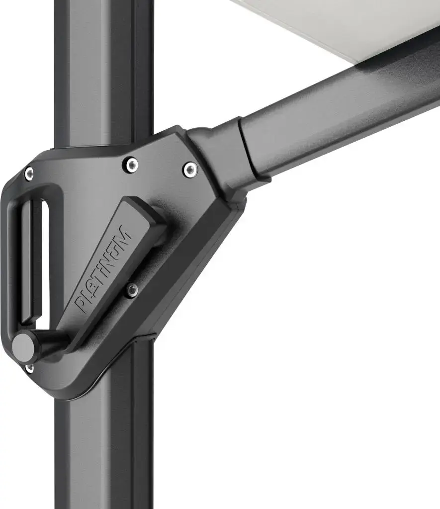 - Parasolvoet: De parasol wordt zonder voet geleverd. Wij adviseren deze parasol op een 90kg parasolvoet van Platinum Sun & Shade te plaatsen. Deze zijn uitgevoerd met zwenkwielen zodat de parasol makkelijk te verplaatsen is. Platinum Sun & Shade biedt ook een ingraaf parasolvoet (art.nr. 6900). De ingraaf parasolvoet is geheel verwerkt in de grond. Hierdoor heeft u meer ruimte op uw terras. De ingraafvoet is makkelijk te plaatsen zonder gebruik van beton.