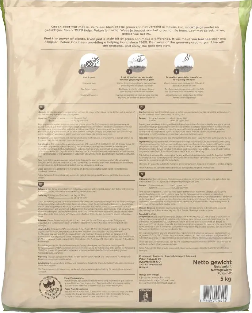 Door je gazon te voeden krijg je een sterk en gezond gazon. Pokon Gazonmest met Kalk 3-in-1 is zeer geschikt voor elk gazon, het hele jaar door. Met één keer voeden bereik je 3 acties tegelijkertijd: