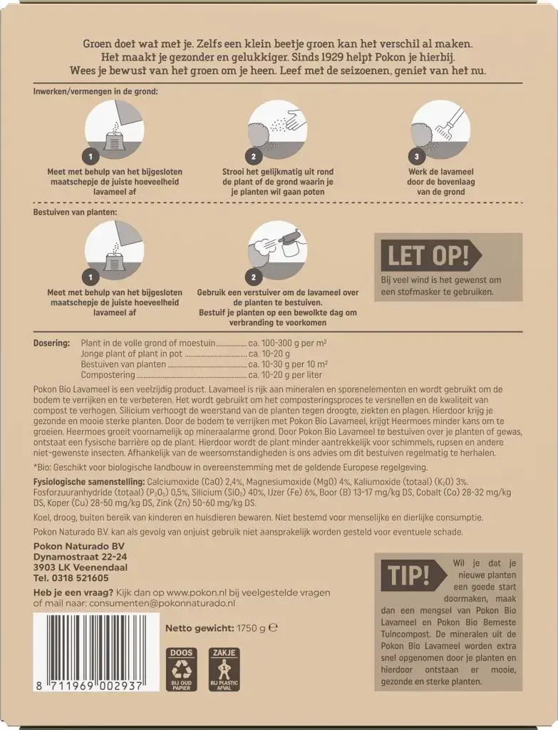 Pokon Bio lavameel is rijk aan mineralen en sporenelementen en wordt gebruikt om de bodem te verrijken en te verbeteren. Hierdoor krijg je mooie en sterke planten.
