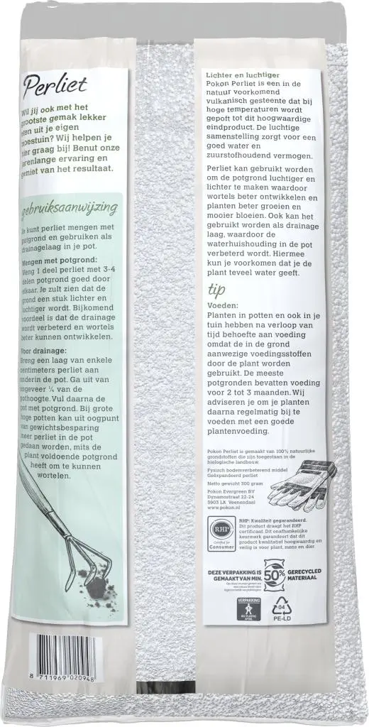 Pokon Bio Perliet is een in de natuur voorkomend vulkanisch gesteente dat bij hoge temperaturen wordt gepoft tot dit hoogwaardige eindproduct. De luchtige samenstelling zorgt voor een goed water en zuurstofhoudend vermogen. Perliet kan gebruikt worden om de potgrond luchtiger en lichter te maken waardoor wortels beter ontwikkelen en planten beter groeien en mooier bloeien. Ook kan het gebruikt worden als drainage laag, waardoor de waterhuishouding in de pot verbeterd wordt. Hiermee kun je voorkomen dat je de plant teveel water geeft.
