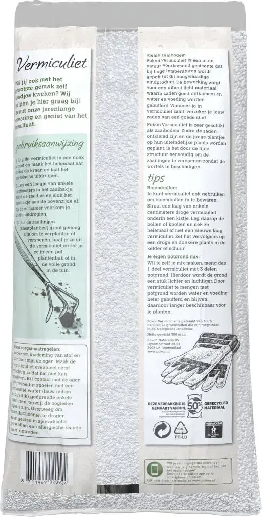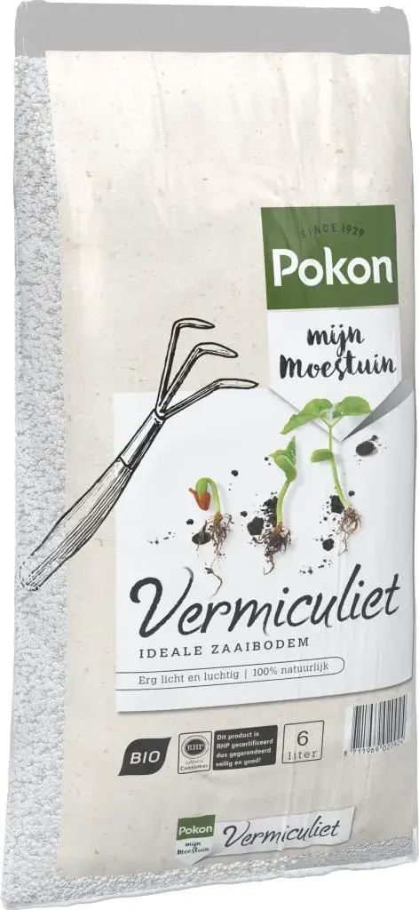 Pokon Bio Vermiculiet is een in de natuur voorkomend gesteente dat bij hoge temperaturen wordt gepoft tot dit hoogwaardige eindproduct. De bewerking zorgt voor een uiterst licht materiaal waarin zaden goed ontkiemen en water en voeding worden gebufferd. Wanneer je in vermiculiet zaait, verzeker je jouw zaden van een goede start. Pokon Vermiculiet is zeer geschikt als zaaibodem. Zodra de zaden ontkiemd zijn en de jonge plantjes op hun uiteindelijke plaats worden geplant, is het door de fijne structuur eenvoudig om de zaailingen te verspenen zonder de wortels te beschadigen. Pokon Vermiculiet is ook zeer geschikt voor het bewaren van bloembollen of om je eigen potgrond mix te maken. Door vermiculiet aan potgrond toe te voegen wordt de grond een stuk lichter en luchtiger. Bovendien worden water en voeding beter gebufferd waardoor deze langer beschikbaar blijven voor je planten.
