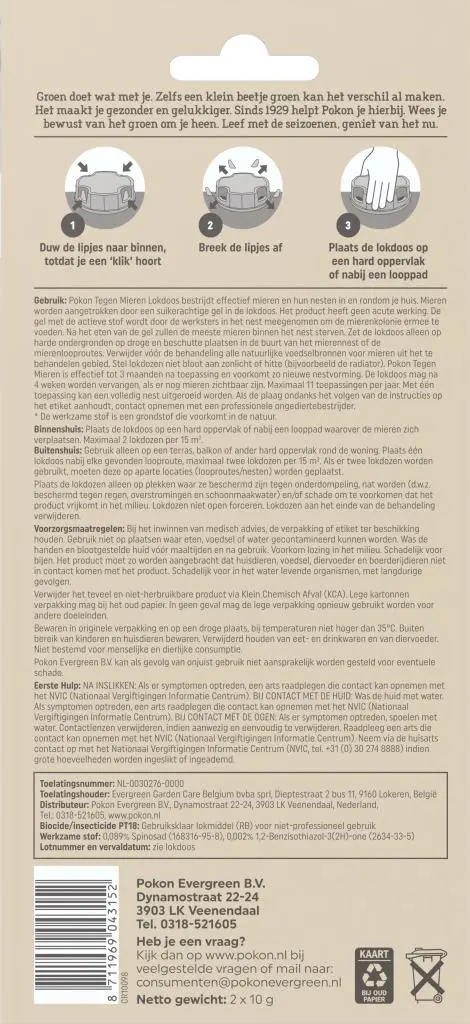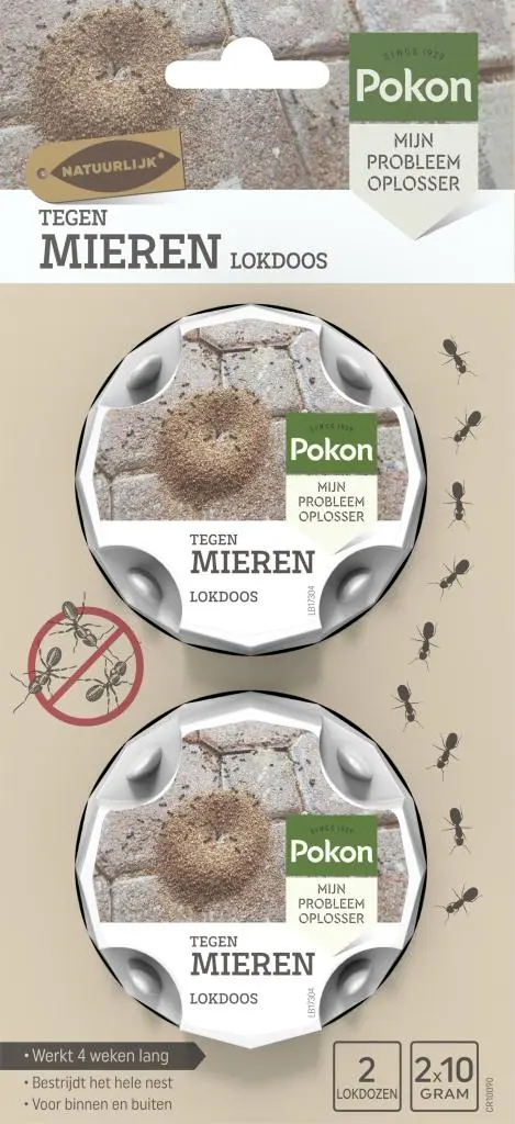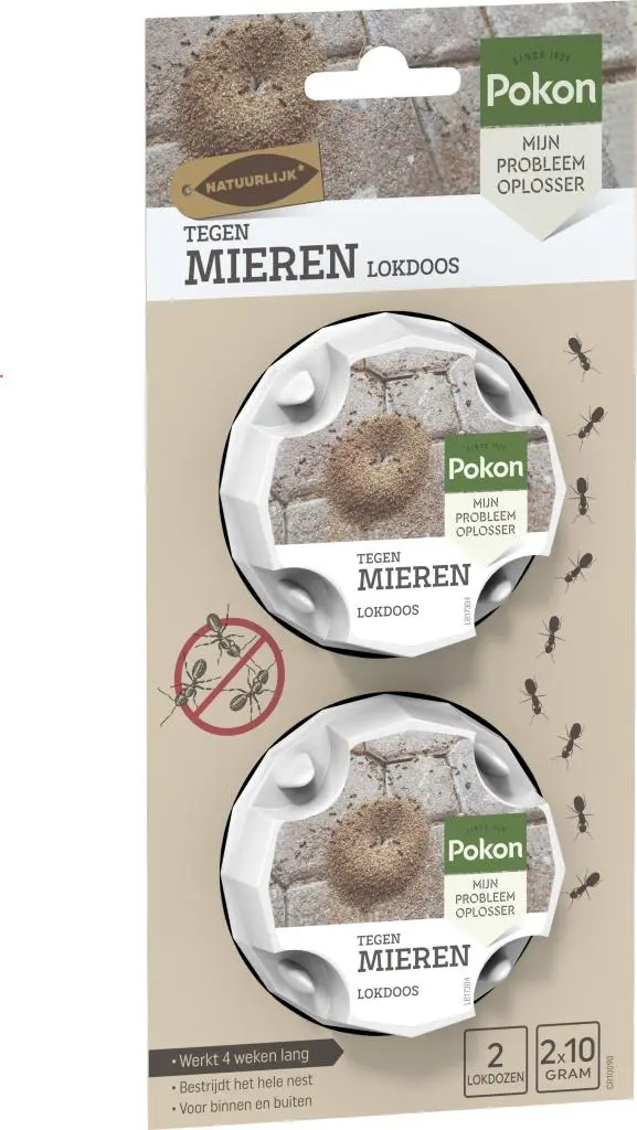 Pokon Tegen Mieren Mier-Ex Lokdoos bestrijdt effectief wegmieren (Lasius niger) en hun nesten in en rondom je woning. Mieren worden aangetrokken door een suikerachtige gel in de lokdoos. Het product heeft geen acute werking. De gel met de actieve stof wordt door de werksters in het nest meegenomen om de mierenkolonie ermee te voeden. Na het eten van de gel zullen de meeste mieren binnen het nest sterven. De mierenkolonie sterft binnen 3 tot 4 weken uit.
