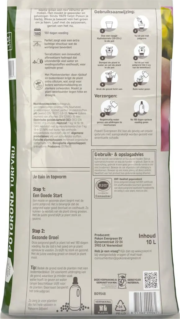 - Samenstelling: kokosgruis, gecomposteerde boomschors, houtvezel, groencompost, rijstkaf, perliet en meststoffen