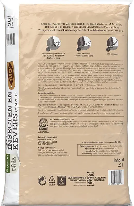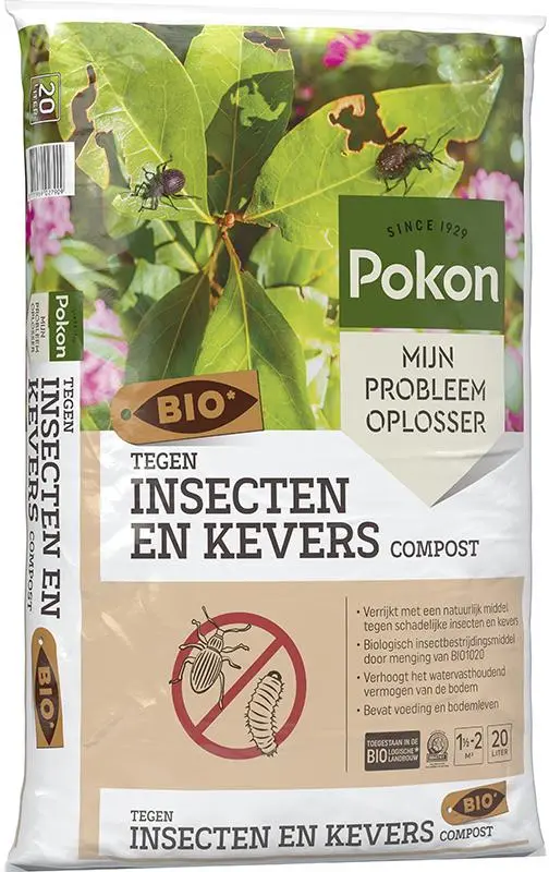 Pokon Tegen Insecten en Kevers Compost bestrijdt op een natuurlijke manier schadelijke insecten en kevers. Deze bijzondere compost bevat een hoog gehalte aan organische stof. Hiermee wordt het humusgehalte in de grond verhoogd. Dit heeft een positief effect op het bodemleven. Hierdoor worden vocht en voeding beter vastgehouden en kunnen planten zich beter ontwikkelen. De compost heeft een optimale werking tussen 15 en 30 graden Celsius.