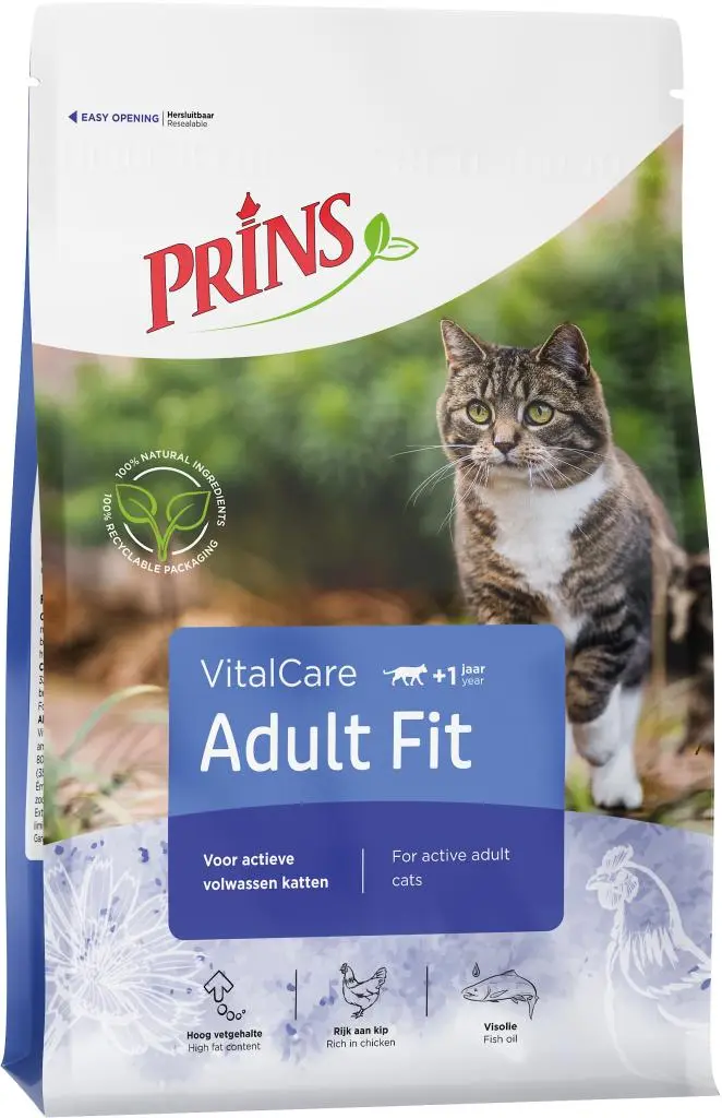 VitalCare Adult Fit is een krokante voeding voor actieve volwassen katten tot ca. 8 jaar. Deze volledige voeding levert voldoende energie voor actieve katten en houdt uw kat in topconditie. VitalCare Adult Fit bevat daarnaast ingrediënten die bijdragen aan een glanzende vacht en helpen de urinewegen gezond te houden.