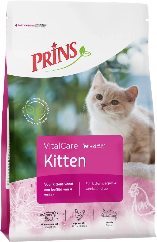 VitalCare Kitten is een krokante voeding voor kittens vanaf 4 weken tot circa 10-12 maanden. Deze volledige voeding draagt bij aan een gezonde groei, een goed werkend immuunsysteem en een optimale ontwikkeling van botten en gewrichten. Door het hoge energiegehalte is VitalCare Kitten ook bijzonder geschikt voor drachtige en zogende katten.