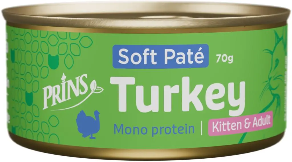 Prins Soft Paté Turkey is een heerlijke, complete vleesmaaltijd voor katten van alle leeftijden. De zachte paté is ideaal als gezonde aanvulling op de brokjes. De voeding is monoprotein en bestaat uit hoogwaardige kalkoen. Dit zorgt voor een smakelijke en goed verteerbare maaltijd. De paté heeft een zachte, gladde structuur zonder stukjes, waardoor het makkelijk te eten is. Gemaakt met 100% natuurlijke ingrediënten, volledig graanvrij én geproduceerd in Europa. De Soft Paté is perfect om af te wisselen met andere Prins natvoedingen.