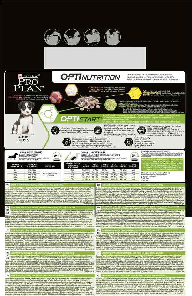Geef uw puppy de voedingsbouwstenen die hij nodig heeft voor een gezonde groei en ontwikkeling met Purina PRO PLAN Healthy Start. Elk hoogwaardig recept droogvoer is speciaal ontwikkeld voor puppy's en bevat uitstekende voedingstoffen en hoogwaardige stukjes kip als #1 ingrediënt. Purina PRO PLAN® Healthy Start PUPPY producten bevatten colostrum wat een deskundige aanpak biedt en het immuunrespons van de puppy's tot wel 50% meer helpt te versterken. Colostrum helpt ook om de balans van de darmmicroflora te optimaliseren - het helpt de puppy's te beschermen tegen dunne ontlasting dat vaak voorkomt in de puppytijd. Purina PRO PLAN® Healthy Start bevat een aangepaste eiwit- en vetgehaltes om een gezonde groei en gezondheid op lange termijn te bevorderen. Daarnaast bevat het ook voedingsstoffen die helpen om gezonde gewrichten te ondersteunen. Purina PRO PLAN Healthy Start MEDIUM PUPPY is geschikt voor puppy's van medium rassen (10-25 kg volwassen gewicht). Dit droge puppyvoeding bevat viamine D, mineralen en specifieke hoeveelheden omega-3 (0,3%) om gezonde tanden en tandvlees te ondersteunen. Het is rijk aan kip van hoge kwaliteit en bevat optimale voedingsstoffen om de groei van uw medium puppy tot 12 maanden te ondersteunen, wanneer ze zullen uitgroeien tot volwassen honden. Ook geschikt voor drachtige / zogende teven.