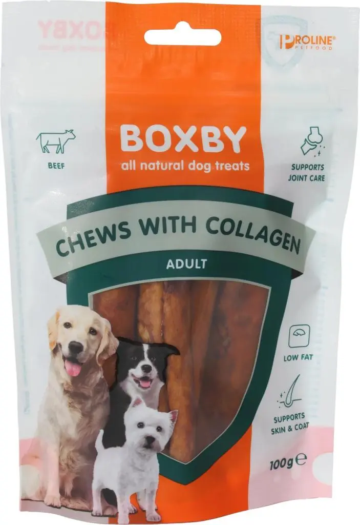 Maak kennis met de Boxby collagen chews: een kauwbot dat een verantwoorde keuze is voor hondenliefhebbers. Deze kauwstaaf is gemaakt zonder rawhide en bevat collageen, wat kan bijdragen aan soepele gewrichten, een gezonde huid en een glanzende vacht.