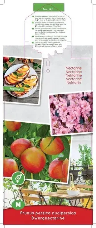 Deze mooie dwergnectarine groeit enkele centimeters per jaar en geeft echte vruchten. Deze dwergperzik staat op een innovatieve onderstam welke ervoor zorgt dat de dwerg langzaam en gecontroleerd groeit. Hiernaast verbetert deze onderstam de kenmerken van de vruchten. Ook kan deze dwerg zeer goed tegen temperaturen tot -15 graden celcius. Uitermate geschikt voor balkon of terras. Zelfbestuivend. Snoeien is bijna niet nodig. Bemesting: eenmaal per jaar wat bijmesten met organische meststof.