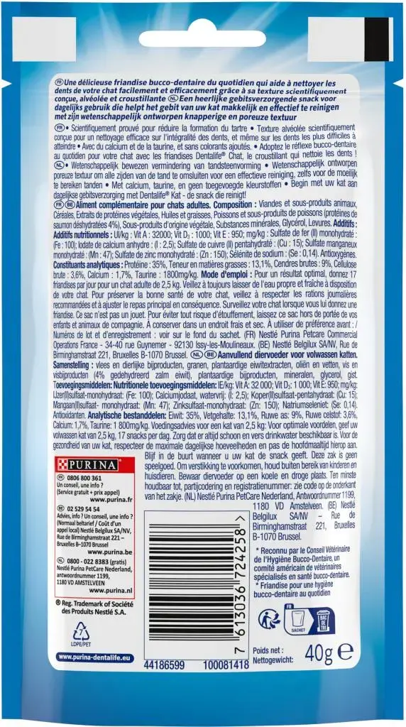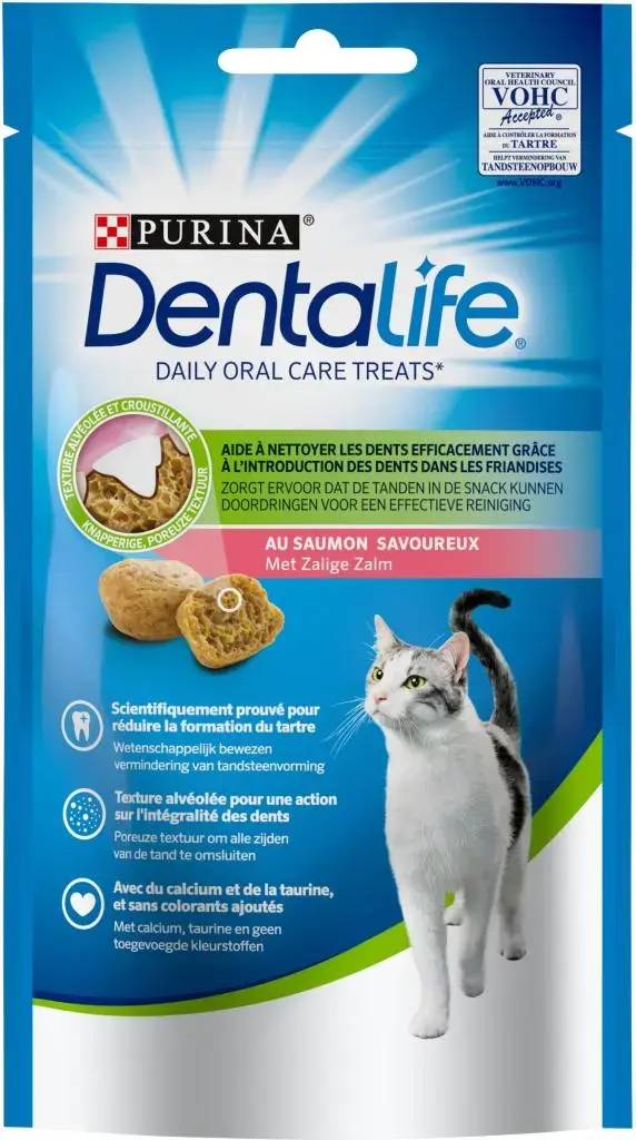 Met Purina Dentalife Denta Care Snacks Zalm 40 g combineer je heerlijke smaak met effectieve gebitsverzorging – elke dag opnieuw.