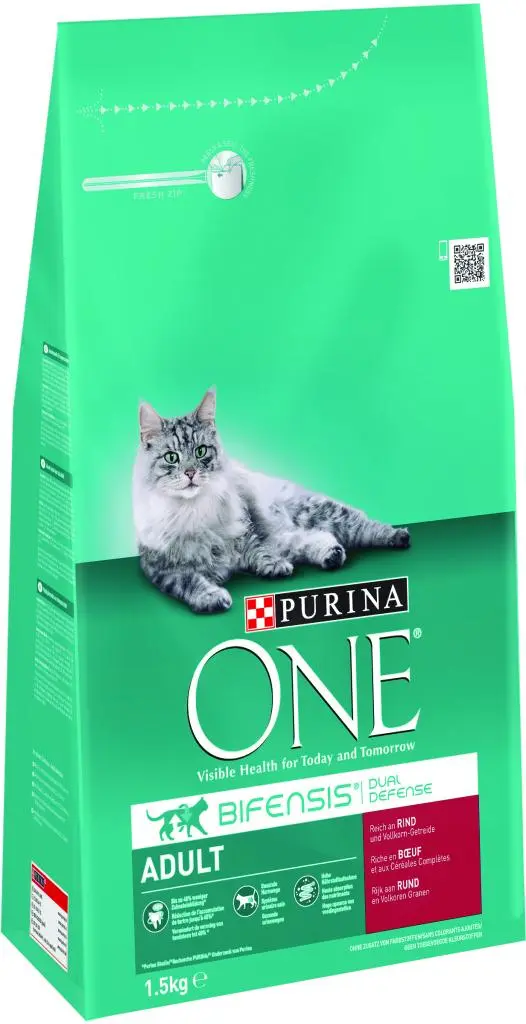ZICHTBARE GEZONDHEID VOOR VANDAAG EN MORGEN PURINA ONE Adult is qua voedingswaarde afgestemd op katten van 1 jaar en ouder Een uitgebalanceerd darmmicrobioom is essentieel voor de goede gezondheid van jouw kat.Het heeft een direct invloed op hun afweersysteem. Het microbioom is een ecosysteem met biljoenen micro-organismen die in de darm leven en uniek zijn voor elke kat.De balans van micro-organismen is belangrijk om een positief effect te hebben op de spijsvertering, het natuurlijke afweersysteem en het algehele welzijn van jouw kat.PURINA ONE BIFENSIS is een voedingsformule met een heilzame functionele bacterie: Lactobacillus, waarvan wetenschappelijk is bewezen dat dit het afweersysteem van jouw kat van binnenuit stimuleert en een gezond darmmicrobioom helpt beschermen. Purina ONE BIFENSIS bevat kwalitatief hoogwaardige ingrediënten, waaronder het prebioticum: cichorei, dat goede bacteriën in de darmen voedt om het darmmicrobioom van jouw kat te verbeteren voor het behoud van een goede gezondheid van jouw kat.Van een gezonde spijsvertering en een sterk afweersysteem tot een glanzende vacht, je kunt zichtbare resultaten zien in de gezondheid van jouw kat vandaag en morgen.