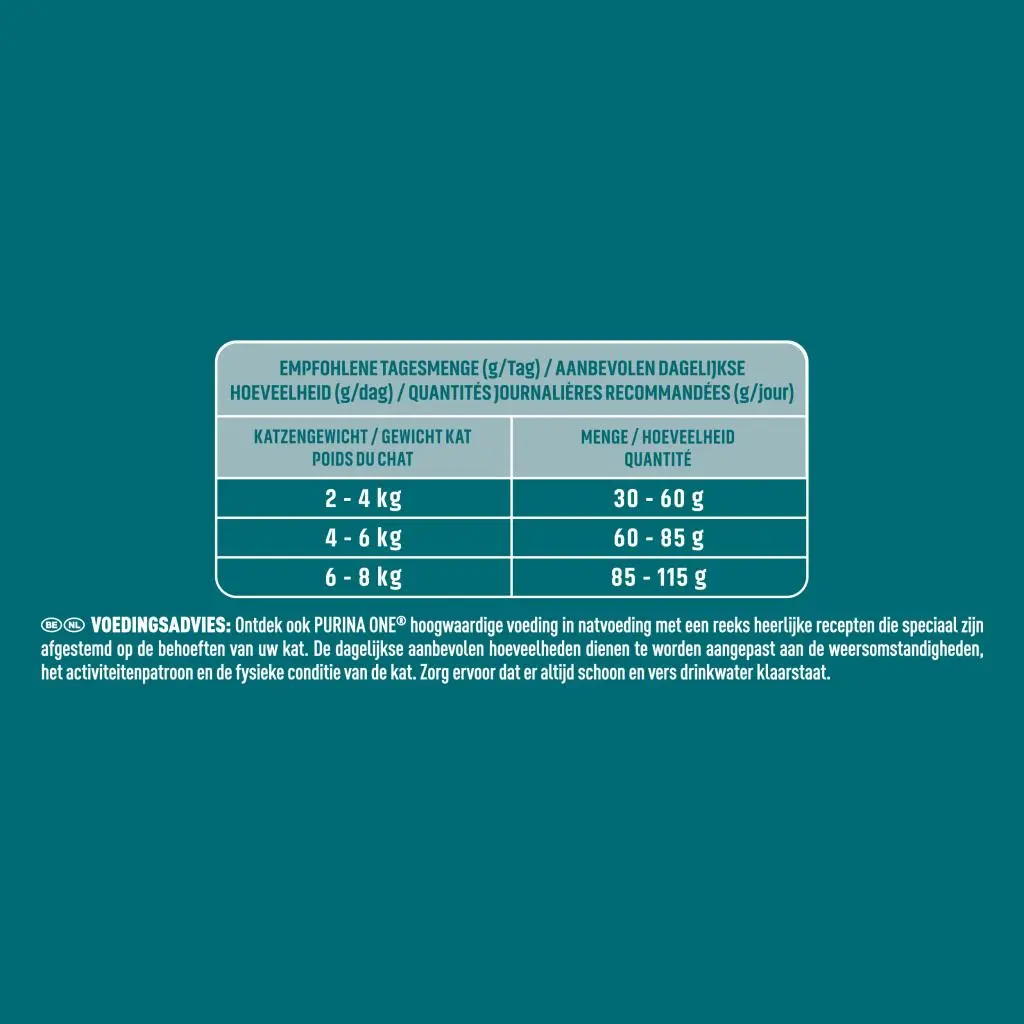 PURINA ONE® Adult kattenvoer Rijk aan Kip is speciaal afgestemd op volwassen katten (van 1 jaar en ouder). PURINA ONE® kattenvoer is bereid met hoogwaardige ingrediënten, zoals kip als nummer één ingrediënt, en cichorei, een prebioticum dat de balans van het darmmicrobioom verbetert. Het microbioom is een ecosysteem met biljoenen micro-organismen die in de darm leven en uniek zijn voor elke kat. De balans van micro-organismen is belangrijk om een positief effect te hebben op de spijsvertering, het afweersysteem en het algehele welzijn van jouw kat. Ontwikkeld door Purina's dierenartsen en voedingsdeskundigen, bevatten PURINA ONE® BIFENSIS® kattenbrokken een nutritionele formule met een heilzame functionele bacterie: Lactobacillus, waarvan wetenschappelijk is bewezen dat dit het immuunsysteem van jouw kat van binnenuit versterkt en een gezond darmmicrobioom helpt beschermen. PURINA ONE® BIFENSIS® is verkrijgbaar in een breed assortiment van smaakvolle, knapperige kattenbrokjes en natvoer met hoogwaardige ingrediënten, afgestemd op de levensstijl en levensfase van jouw kat. PURINA ONE® Zichtbare gezondheid voor vandaag en morgen.