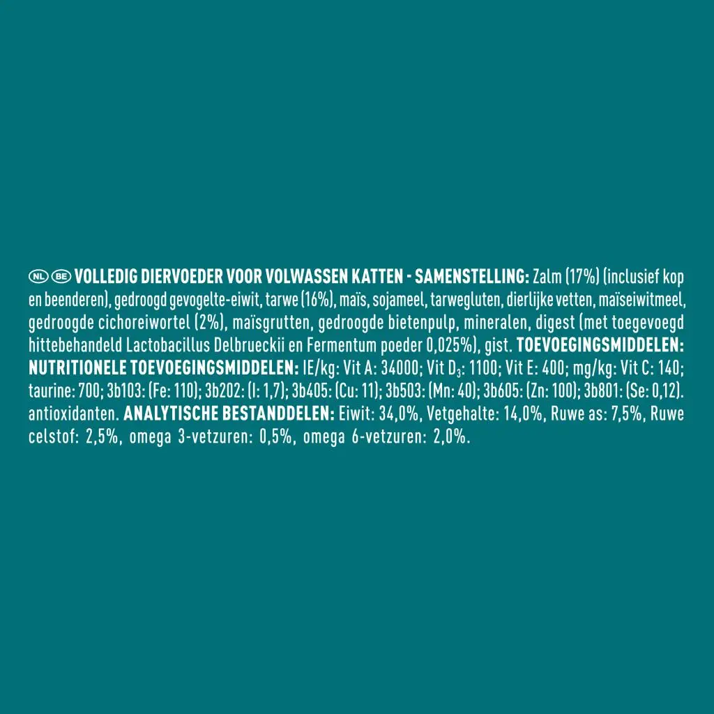 Samenstelling : zalm (17%) (inclusief kop en beenderen), gedroogd gevogelte-eiwit, tarwe (16%), maïs, sojameel, tarwegluten, dierlijke vetten, maïseiwitmeel, gedroogde cichoreiwortel (2%), maïsgrutten, gedroogde bietenpulp, mineralen, digest (met toegevoegd hittebehandeld Lactobacillus Delbrueckii en Fermentum poeder 0,025%), gist.