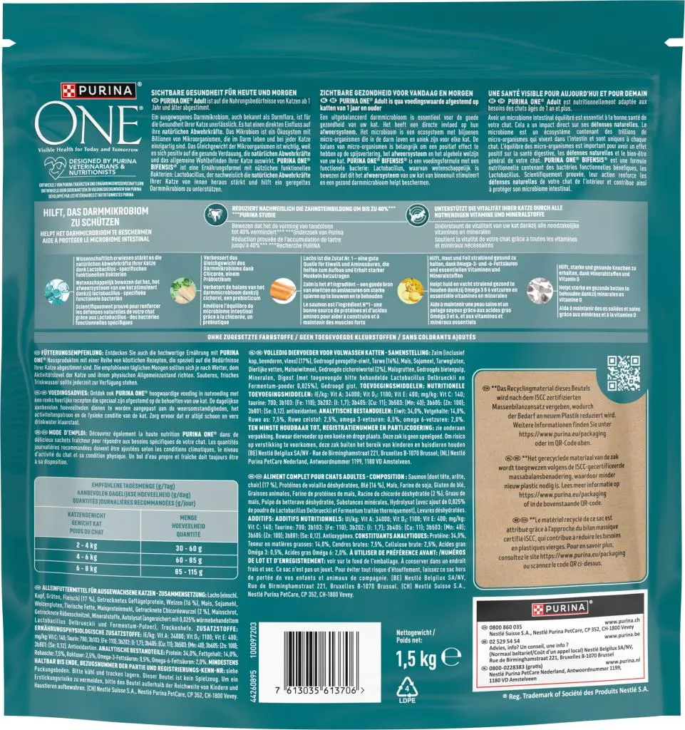 ZICHTBARE GEZONDHEID VOOR VANDAAG EN MORGENPURINA ONE Adult is qua voedingswaarde afgestemd op katten van 1 jaar en ouderEen uitgebalanceerd darmmicrobioom is essentieel voor de goede gezondheid van jouw kat.Het heeft een directe invloed op hun afweersysteem. Het microbioom is een ecosysteem met biljoenen micro-organismen die in de darm leven en uniek zijn voor elke kat.De balans van micro-organismen is belangrijk om een positief effect te hebben op de spijsvertering, het afweersysteem, en het algehele welzijn van jouw kat.PURINA ONE BIFENSIS is een voedingsformule met een heilzame functionele bacterie: Lactobacillus, waarvan wetenschappelijk is bewezen dat dit het afweersysteem van jouw kat van binnenuit stimuleert en een gezond darmmicrobioom helpt beschermen. Purina ONE BIFENSIS bevat kwalitatief hoogwaardige ingrediënten, waaronder het prebioticum: cichorei, dat goede bacteriën in de darmen voedt om het darmmicrobioom van jouw kat te verbeteren voor het behoud van een goede gezondheid van jouw kat.Van een gezonde spijsvertering en een sterk afweersysteem tot een glanzende vacht, je kunt zichtbare resultaten zien in de gezondheid van jouw kat vandaag en morgen.