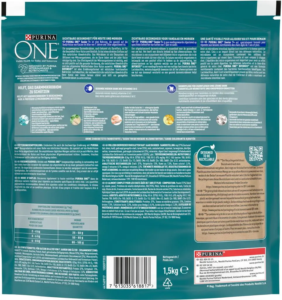 ZICHTBARE GEZONDHEID VOOR VANDAAG EN MORGEN PURINA ONE® Senior 7+ is een voeding die is gericht op de specifieke behoeften van katten van 7 jaar en ouder. Een uitgebalanceerd darmmicrobioom is essentieel voor de gezondheid van uw kat. Het heeft een directe invloed op hun afweersysteem. Het microbioom is een ecosysteem met biljoenen micro-organismen die in de darm leven en uniek zijn voor elke kat. De balans van micro-organismen is belangrijk om een positief effect te hebben op de spijsvertering, het afweersysteem en het algehele welzijn van uw kat. PURINA ONE BIFENSIS® is een voedingsformule met een nuttige functionele bacterie: Lactobacillus, wetenschappelijk bewezen dat dit het afweersysteem van uw kat van binnenuit versterkt en een gezond darmmicrobioom helpt beschermen.