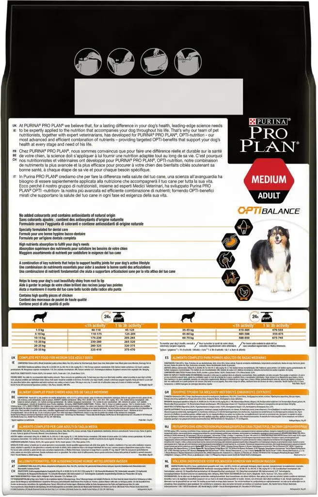 Vervul de dagelijkse behoeftes van uw hond met het assortiment van Purina PRO PLAN Everyday Nutrition. Purina PRO PLAN Everyday Nutrition bestaat uit stukjes kip van hoge kwaliteit als Nr.1 ingrediënt en is speciaal samengesteld om te voldoen aan alle voedingsbehoeften van uw hond als onderdeel van een gezonde levensstijl. Deze droge hondenvoeding bevat een combinatie van specifieke voedingsstoffen die uitgebalanceerd zijn om een superieure opname van voedingsstoffen te bevorderen voor de algehele gezondheid van uw hond. Deze formules ondersteunen gezonde gewrichten voor een actieve levensstijl en houden hun vacht glanzend van wortel tot punt. Het hoge eiwitgehalte draagt bij aan het behoud van sterke spieren, een ideale lichaamsconditie en ondersteunt het welzijn van uw hond. Purina PRO PLAN Everyday Nutrition MEDIUM ADULT is ontwikkeld voor volwassen honden van middelgrote rassen (10-25 kg gewicht). Deze hondenvoeding bevat vitamine D, mineralen en speciefieke gehaltes aan omega-3 (0,3%) om een gezond gebit en tandvlees te ondersteunen. Het is rijk aan kip van hoge kwaliteit en biedt optimale voeding om de avonturen van uw middelgrote hond van 12 maanden tot 7 jaar te ondersteunen. Daarna kunt u overstappen naar het assortiment van Age Defence. Ontdek de voordelen die de Everyday Nutrition recepten kunnen bieden voor de gezondheid en het welzijn van uw hond. Als u uw hond wat afwisseling wilt geven, ontdek dan de verschillende smaken van de PRO PLAN recepten met extra voordelen – bijvoorbeeld; Lam in Sensitive Digestion of Zalm in de Sensitive Skin producten..