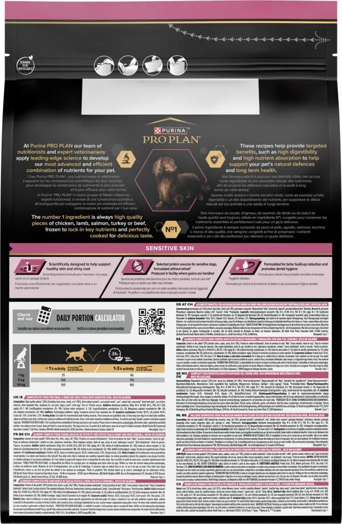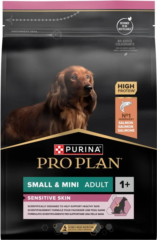 Verzorg de gevoelige huid en vacht van uw hond met PRO PLAN Sensitive Skin droog hondenvoer dat wetenschappelijk is ontworpen om een gezonde huid en glanzende vachten te ondersteunen. Purina PRO PLAN Sensitive Skin droog hondenvoer is gemaakt met zalm van hoge kwaliteit als Nr.1 ingrediënt. Dit droge hondenvoer is zorgvuldig geformuleerd met geselecteerde eiwitbronnen en zonder tarwe, waardoor het vooral geschikt is voor gevoelige honden. Verhoogde waardes van omega 3-vetzuren (0,8%) helpen de gevoelige huid te ondersteunen. Het hoge eiwitgehalte helpt de spieren en een ideale lichaamsconditie te behouden. Deze formule is gemaakt om het beste uit uw hond te halen. Purina PRO PLAN Sensitive Skin SMALL&MINI ADULT is ontwikkeld voor volwassen honden van kleine & zeer kleine rassen (tot 10 kg gewicht). Dit droge hondenvoer bevat vitamine D, mineralen en specifieke waardes van omega-3 (0,8%) om gezonde tanden en tandvlees te ondersteunen. Het is rijk aan zalm van hoge kwaliteit en biedt optimale voeding voor de avonturen van uw kleine hond van 12 maanden tot 9 jaar oud, waarna u moet overstappen naar een Age Defence product. Ontdek de voordelen die de Sensitive Skin producten kunnen hebben voor de gezondheid en het welzijn van uw hond. Als u uw hond graag variatie biedt, ontdek dan de verschillende smaken van de PRO PLAN producten met extra voordelen - bijvoorbeeld Kip in Everyday Nutrition of Lam in Sensitive Digestion. Deze producten worden geproduceerd in een faciliteit waar granen worden verwerkt.