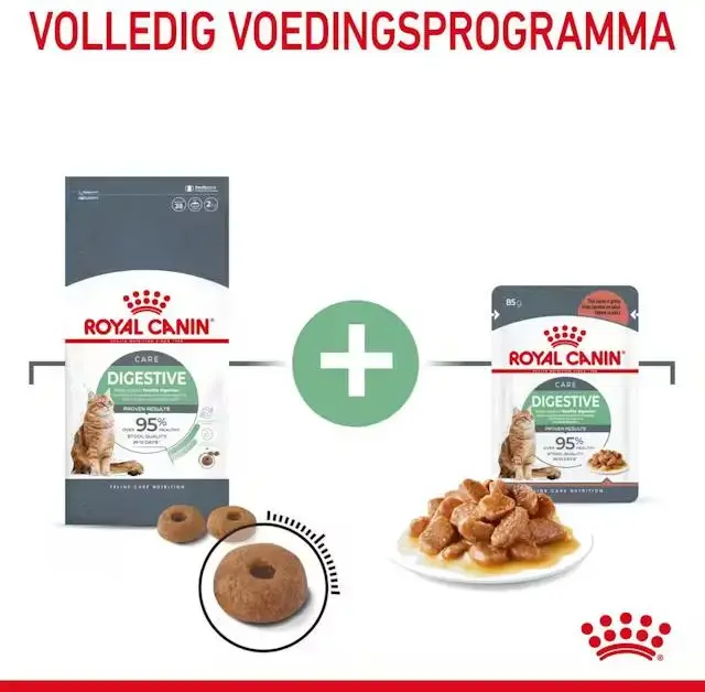 ROYAL CANIN® Digestive Care is een complete en uitgebalanceerde voeding die speciaal is ontwikkeld om een gezonde spijsvertering te helpen ondersteunen. Dankzij het gebruik van zeer goed verteerbare eiwitten (L.I.P.) en een combinatie van prebiotica en vezels (waaronder psyllium) helpt deze formule de vorming van een optimale stoelgang te ondersteunen. ROYAL CANIN® Digestive Care heeft bewezen resultaten. Uit een interne studie* van Royal Canin blijkt dat deze voeding de deelnemende katten in 10 dagen helpt om meer dan 95% betere kwaliteit van de ontlasting te bereiken. ROYAL CANIN® Digestive Care is ook verkrijgbaar als natvoeding met brokjes in saus. Door natvoeding en droogvoeding te combineren, bied je je kat de variatie waar ze zo van houdt.