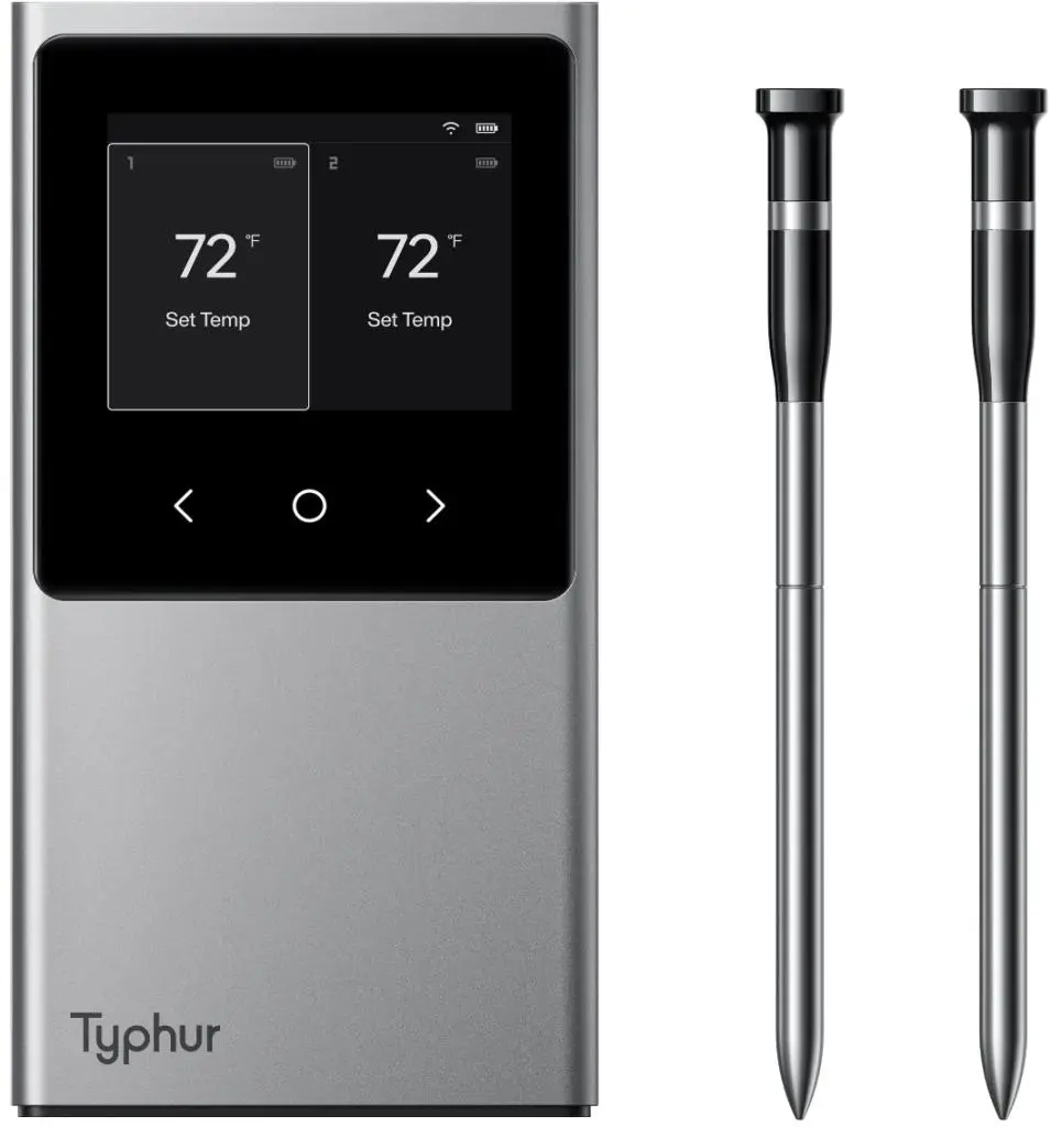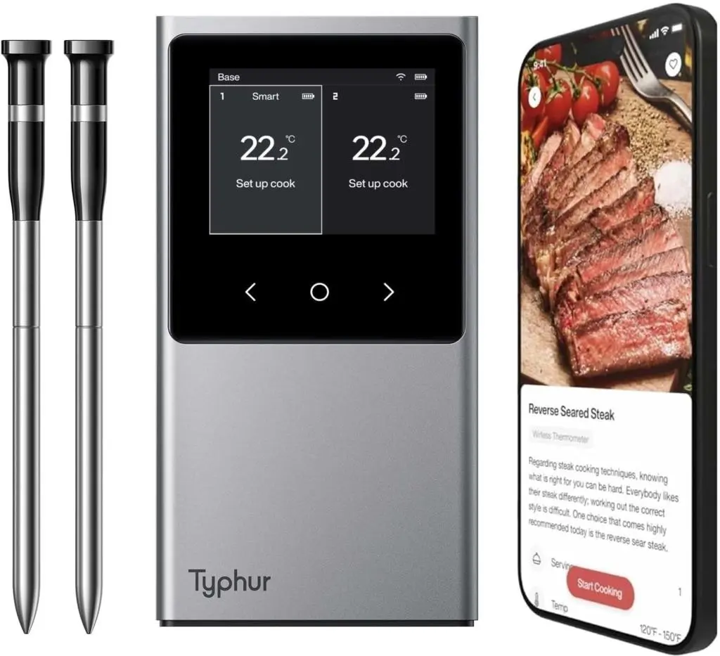 De Typhur Sync Dual is je slimme hulp voor nauwkeurig en zorgeloos koken. Deze draadloze vleesthermometer meet uiterst precies en geeft je via de handige app continu inzicht in zowel de kerntemperatuur als de temperatuur van de omgeving. Dankzij de zes sensoren per probe weet je precies hoe jouw gerecht ervoor staat, of je nu een steak grilt of een brisket langzaam laat garen. Het enige wat jij hoeft te doen, is af en toe op je telefoon kijken om te zien dat alles perfect op temperatuur blijft.