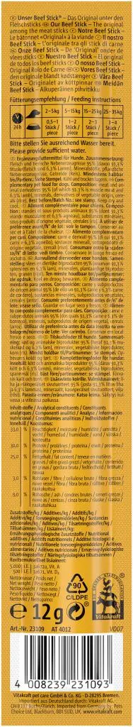 De Vitakraft Beef Stick Original Lam is een zachte, aromatische vleesstick die honden van alle groottes weet te verleiden met zijn pure smaak. Dankzij het extra hoge vleesgehalte krijgt je hond een intense en smakelijke traktatie die aansluit bij zijn natuurlijke behoefte aan vlees. De heerlijke geur maakt de stick nog aantrekkelijker en zorgt ervoor dat hij vrijwel altijd met enthousiasme wordt ontvangen. De zachte structuur maakt de snack ook geschikt voor honden die moeite hebben met harde traktaties.