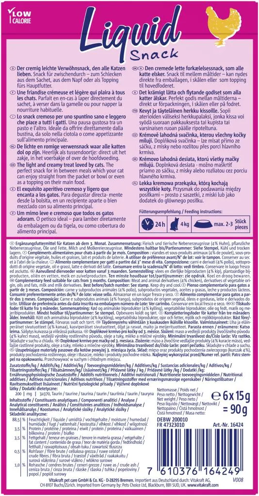 De snack bevat taurine, een belangrijke voedingsstof die bijdraagt aan de ondersteuning van de ogen en de hartfunctie van katten. Dit maakt de liquid snack niet alleen lekker, maar ook functioneel. De zachte samenstelling en het lage vetgehalte maken deze traktatie geschikt voor dagelijks gebruik als aanvulling naast de gewone voeding. Een veelzijdige snack die past bij katten van alle leeftijden en rassen.