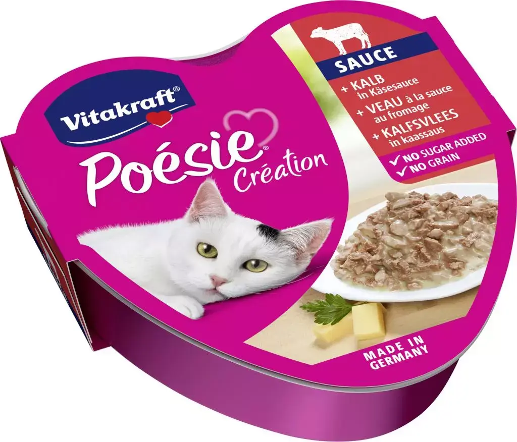 Vitakraft Poésie Création Kalfsvlees in Kaassaus is een volledige natvoeding die speciaal is afgestemd op de behoeften van volwassen katten. De maaltijd bestaat uit mals kalfsvlees in een romige kaassaus en wordt bereid met verse, hoogwaardige ingrediënten. Dankzij de suikervrije receptuur en het ontbreken van kunstmatige toevoegingen krijgt je kat een pure en voedzame maaltijd. De zachte structuur en rijke smaak zorgen ervoor dat elke portie een echt genietmoment wordt.