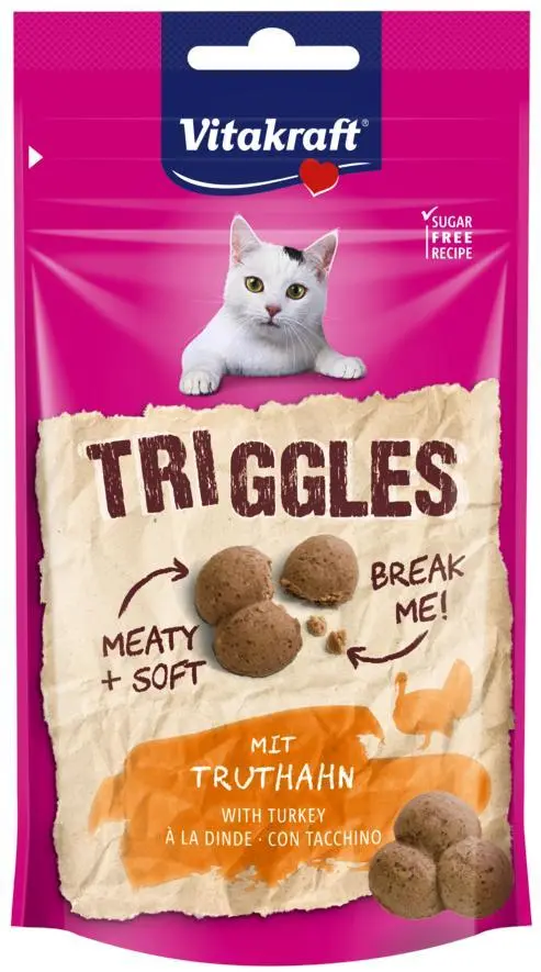 Op zoek naar een smakelijke en veelzijdige snack voor je huistijger? Vitakraft® Triggles zijn stevige, zachte vleeshapjes met ruim 25% smaakvol kalkoenvlees. Dankzij de unieke drievoudige vorm kunnen ze eenvoudig in kleinere stukjes worden gebroken voor extra verwenmomenten. Zorgvuldig in de oven bereid en zonder toegevoegde suikers. Of je ze nu in één stuk of meerdere stukjes geeft, jouw kat zal er dol op zijn!