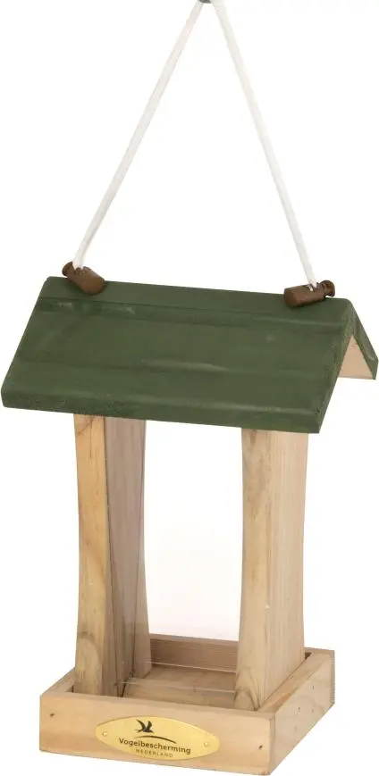 - Hangende voedersilo Gemaakt van FSC-gecertificeerd hout Geschikt voor een grote verscheidenheid aan zaden en zaadmengsels Goedgekeurd door Vogelbescherming Nederland Natuurlijke houtafwerking met stijlvol groen dak