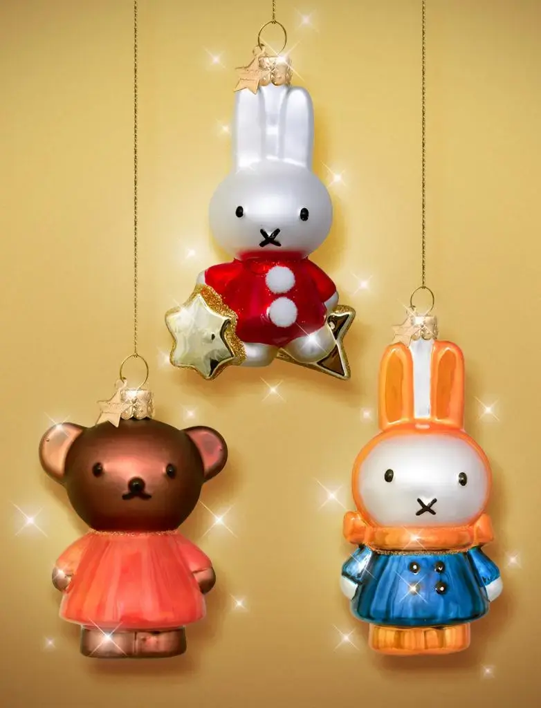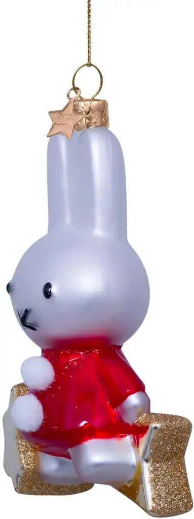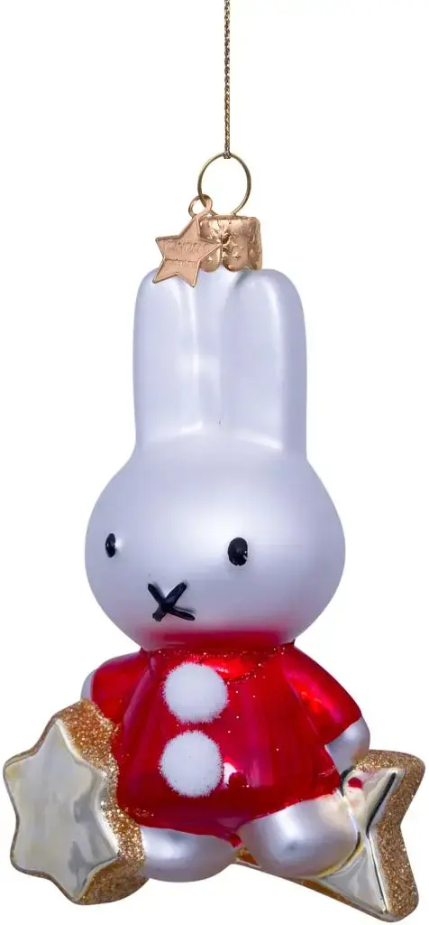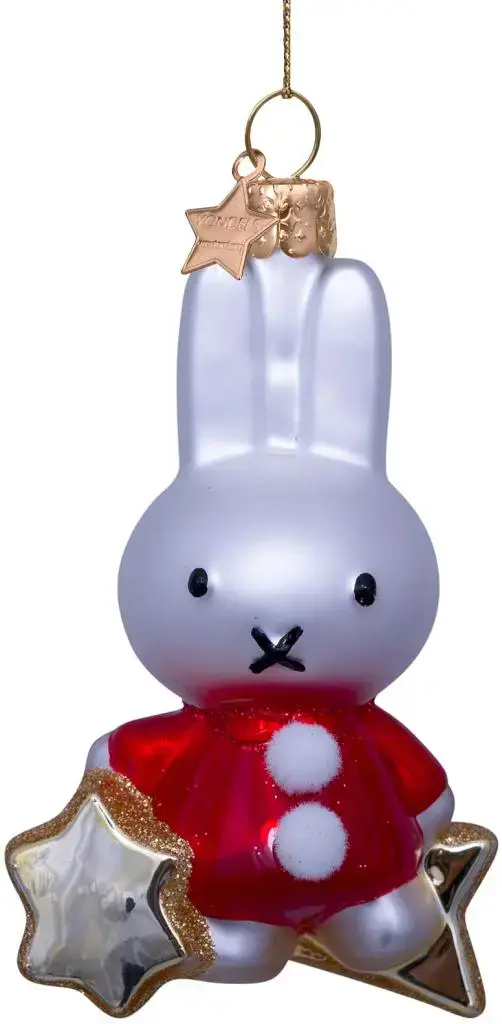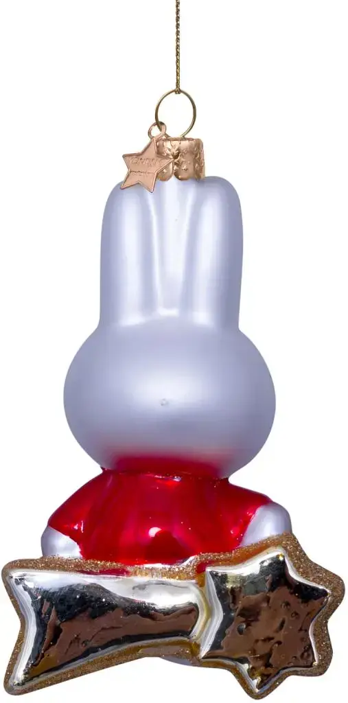 Vondels Nijntje met rode jurk op ster glazen kerstbal. Deze mooie mond geblazen Vondels Amsterdam kersthanger mag natuurlijk niet in jouw kerstboom ontbreken. Dit kerstornament van Vondels is 10,5 cm hoog en daarom goed te combineren met andere glazen kerstballen.
