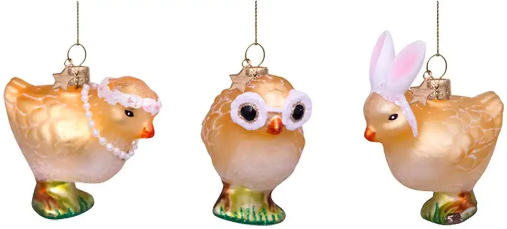 Maak je paasdecoratie extra gezellig met de Vondels paashanger set met 3 glazen kippen. Deze vrolijke hangers brengen meteen een lentegevoel in huis en geven je paastakken, krans of decoratieve takken een speelse, feestelijke uitstraling. Met een hoogte van 6 cm vallen ze mooi op, zonder te overheersen.