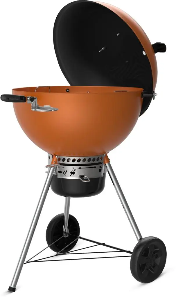 Sommige dingen raken nooit uit de mode, zoals grillen op houtskool, het knetterende geluid van een zomerse barbecue en het iconische silhouet van de Master- Touch houtskoolbarbecue d. 57cm. Deze barbecue valt op door de prachtige Burnt Orange afwerking van de ketel en het deksel.