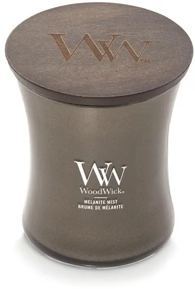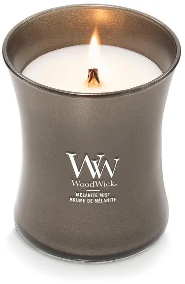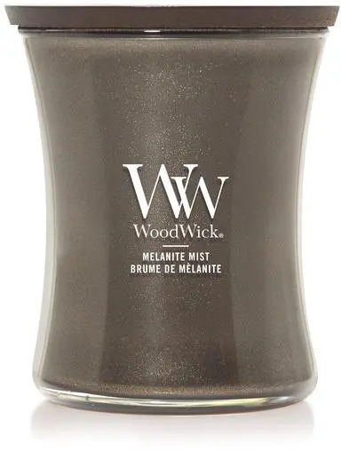 WoodWick limited edition geurkaars melanite mist medium candle is voorzien van een natuurlijk, houten lont waardoor het rustgevende geluid van een knisperend haardvuur een unieke sfeer creëert, terwijl jouw woonruimte gevuld wordt met een authentieke, natuurlijke geur.