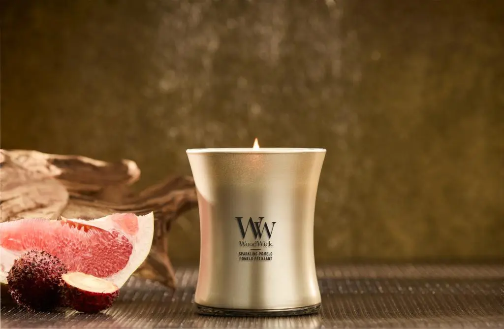 WoodWick limited edition geurkaars sparkling pomelo medium candle is voorzien van een natuurlijk, houten lont waardoor het rustgevende geluid van een knisperend haardvuur een unieke sfeer creëert, terwijl jouw woonruimte gevuld wordt met een authentieke, natuurlijke geur.