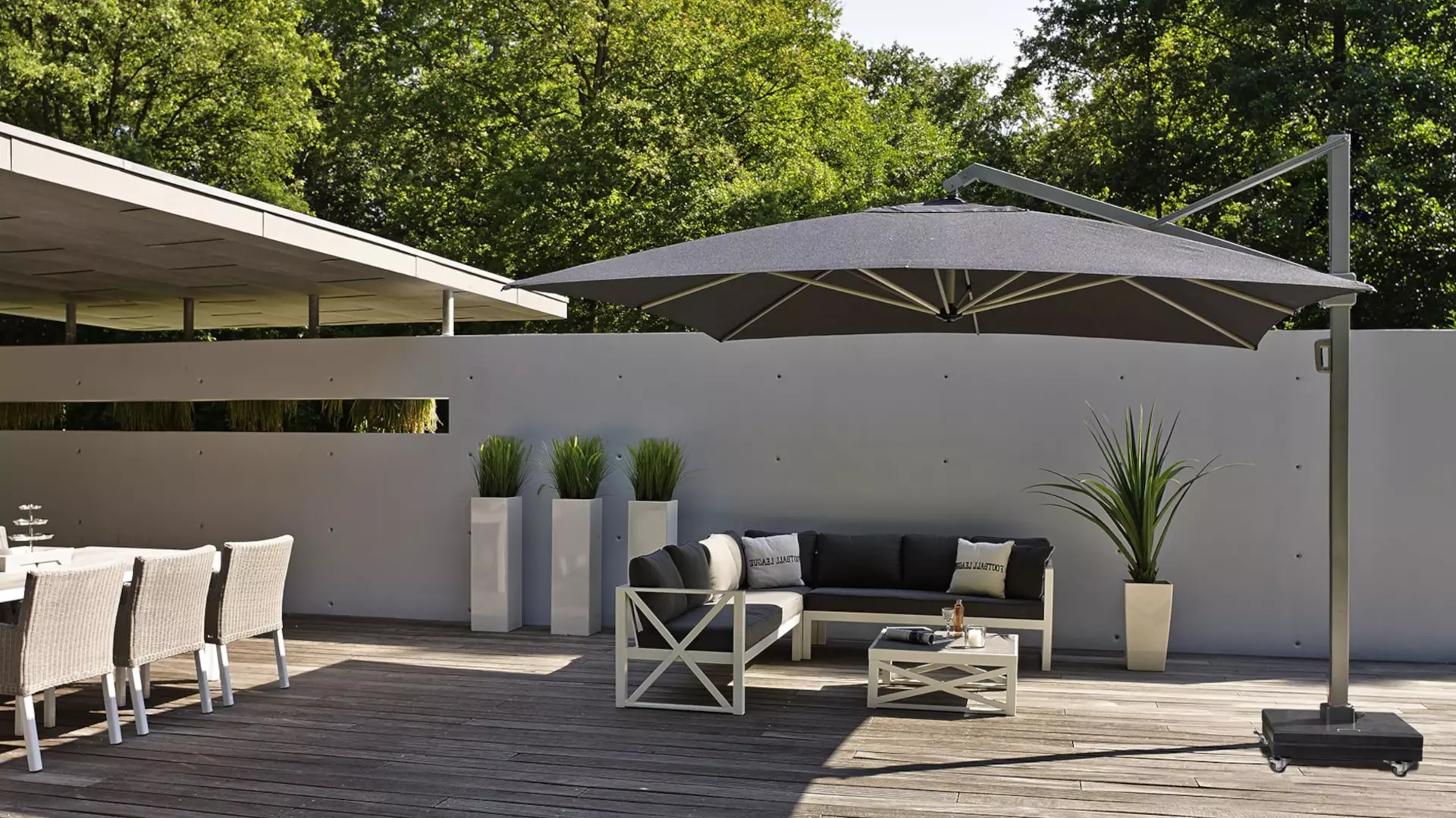 Platinum levert parasols in allerlei soorten en maten: van compacte strandparasol tot royale zweefparasol en zelfs halve parasols die speciaal geschikt zijn voor op een balkon.